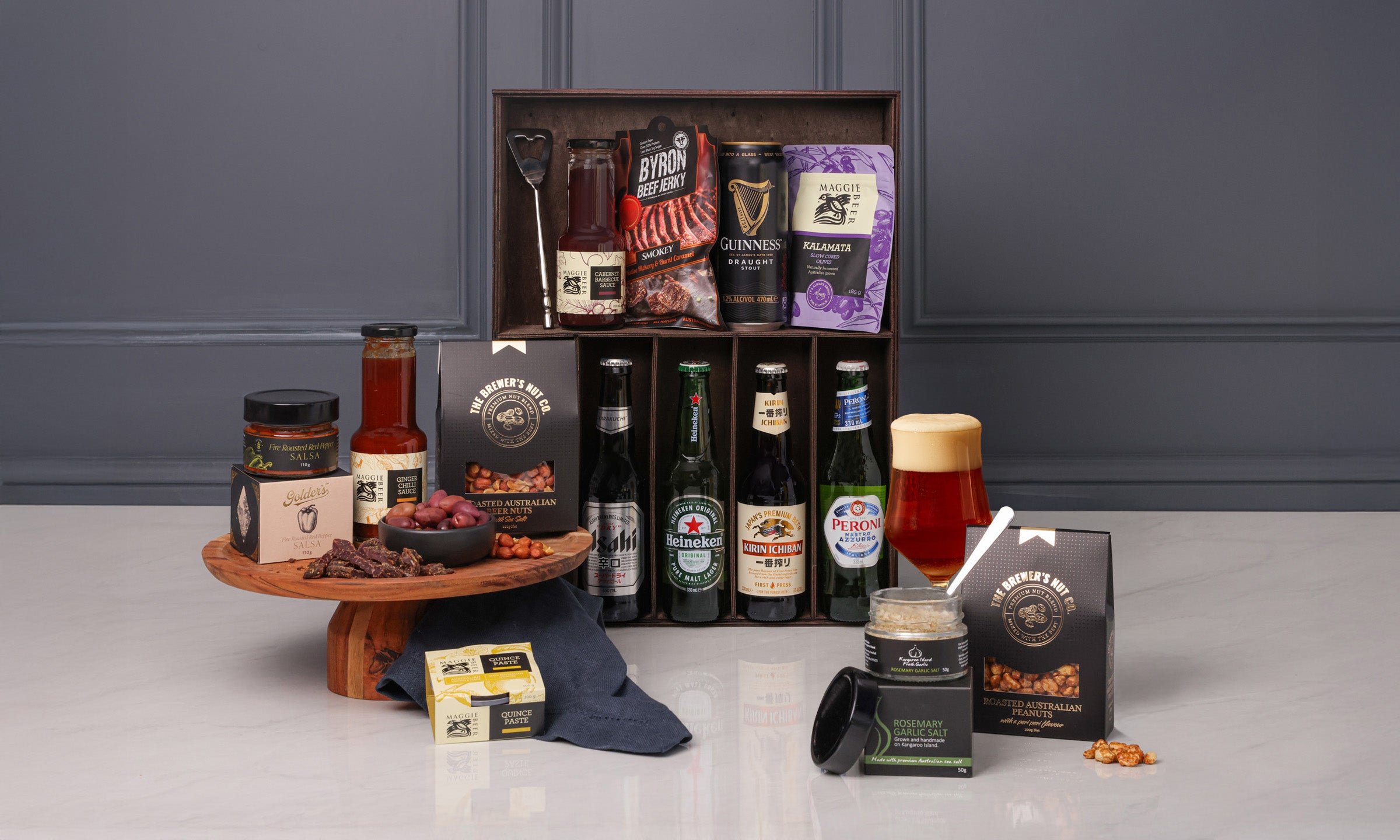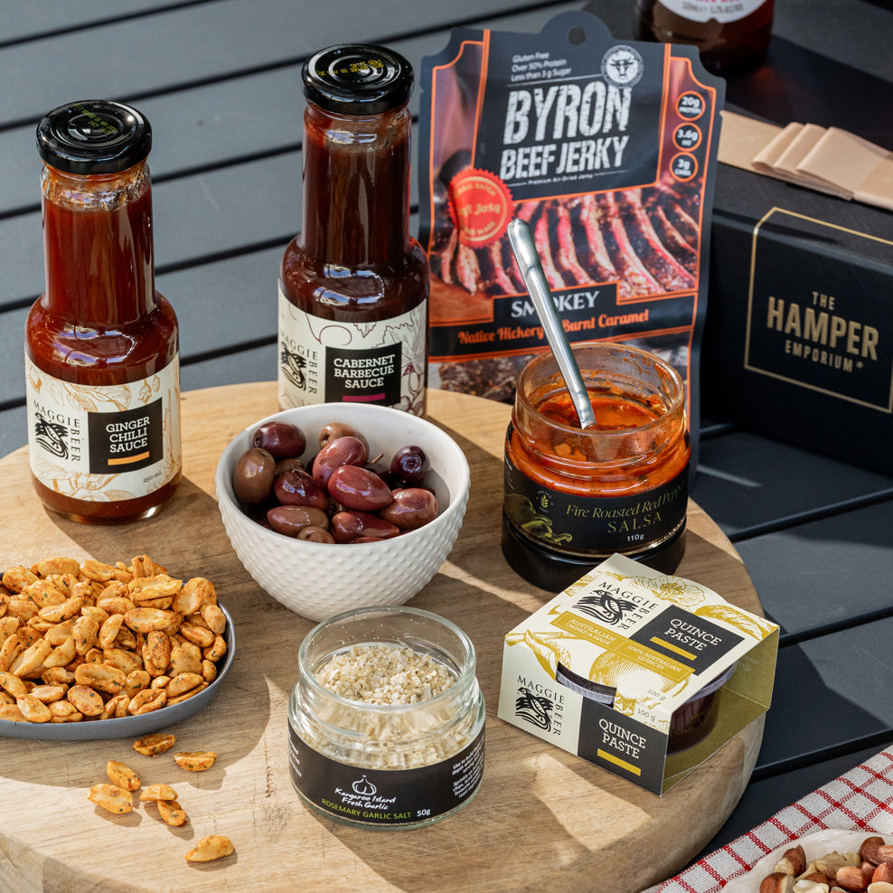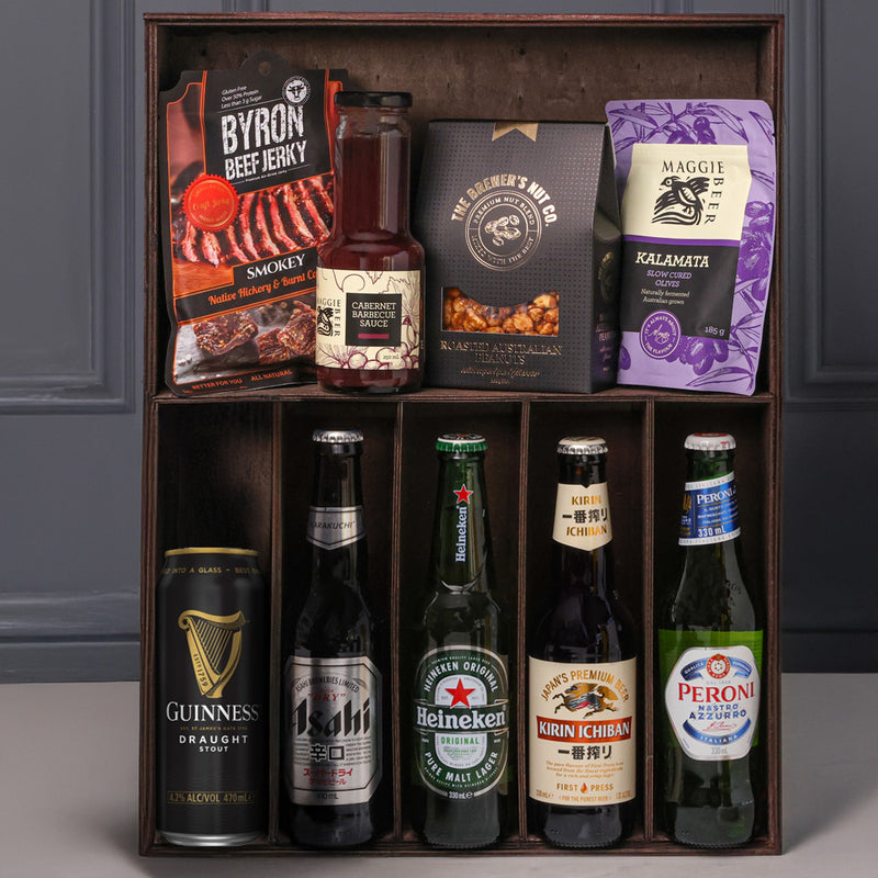 This hamper comes BBQ-ready with Premium International Beers & Gourmet Essentials.