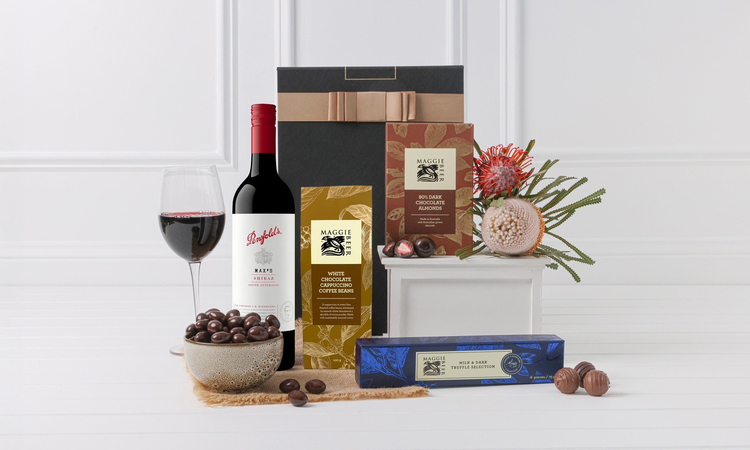 Give them this chocolate hamper from heaven, complete with a bottle of Penfolds Shiraz.