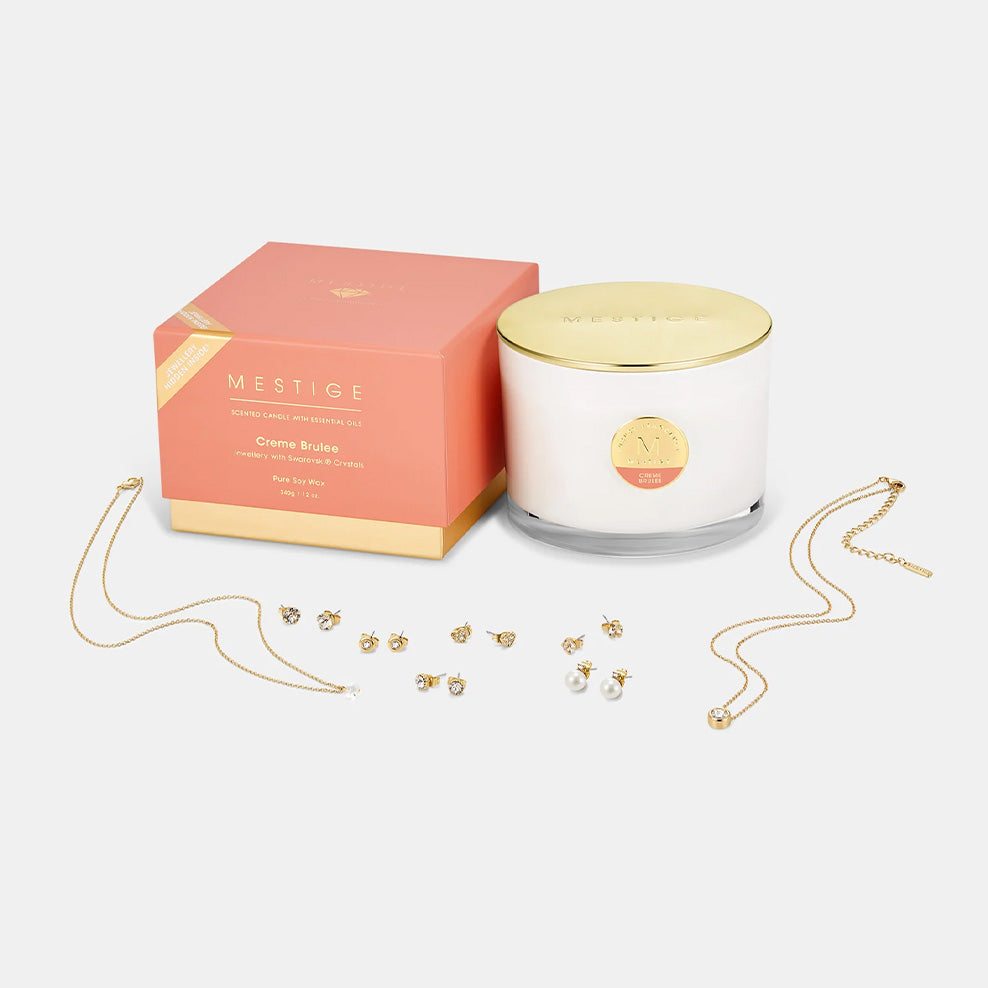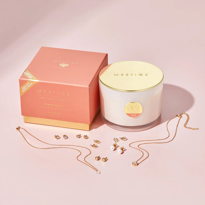 Enjoy burnt sweet caramel, French Vanilla and torched sugar. As the wick burns, find Swarovski jewellery!
