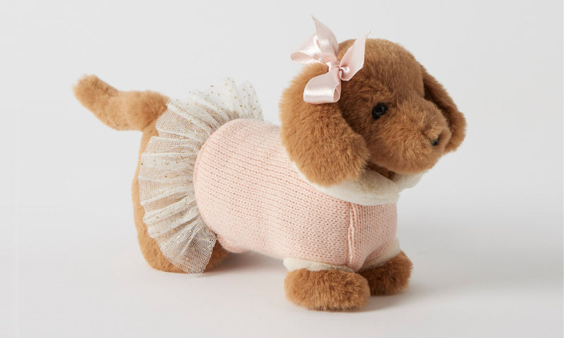 Dalia the Dachshund is a gorgeous soft toy dressed in a pastel pink jumper, tutu, and matching bow.