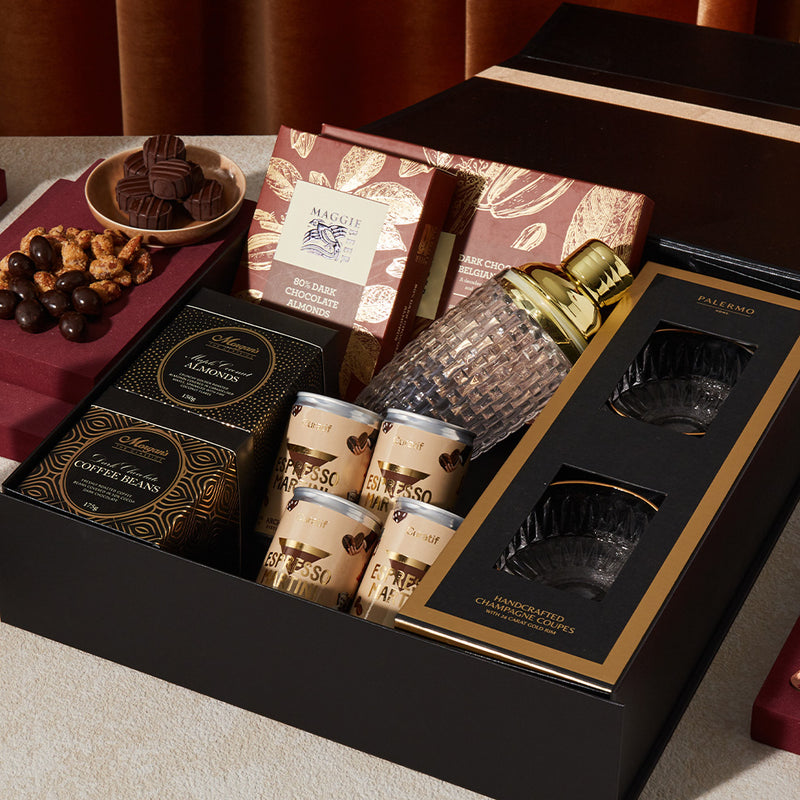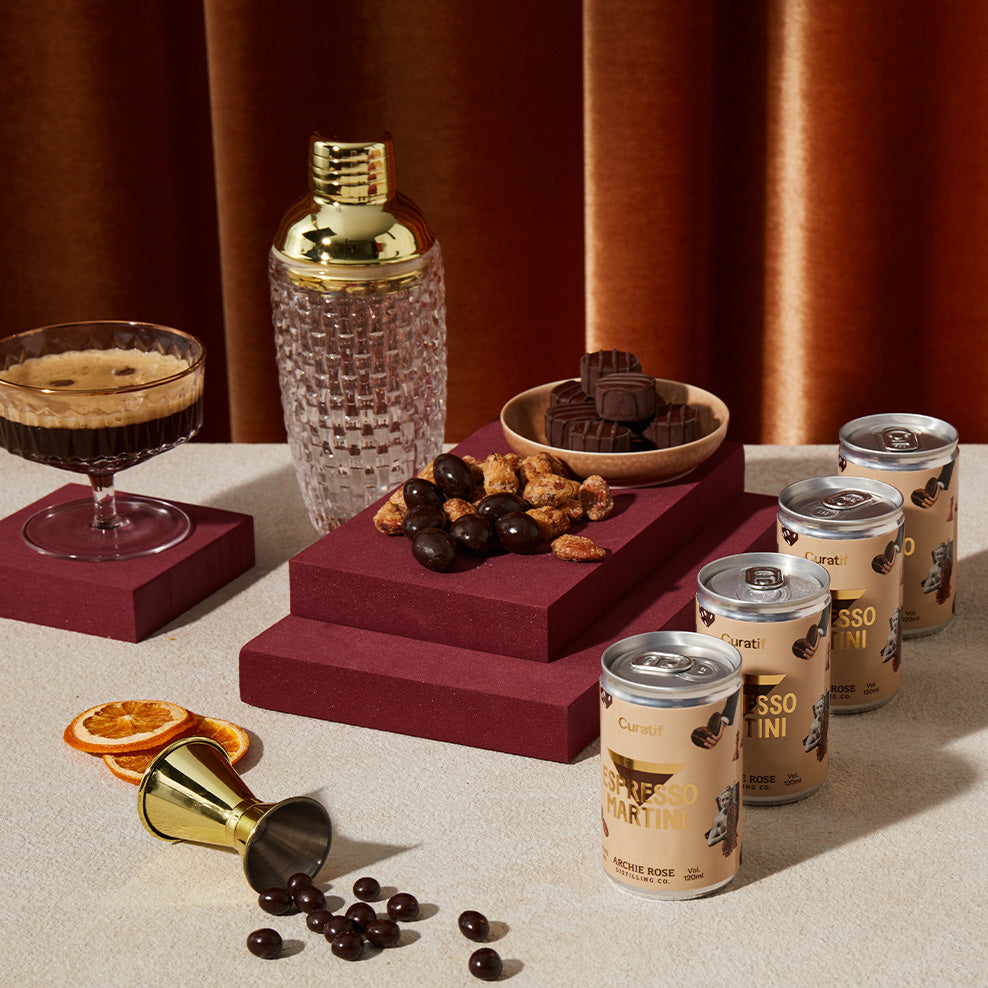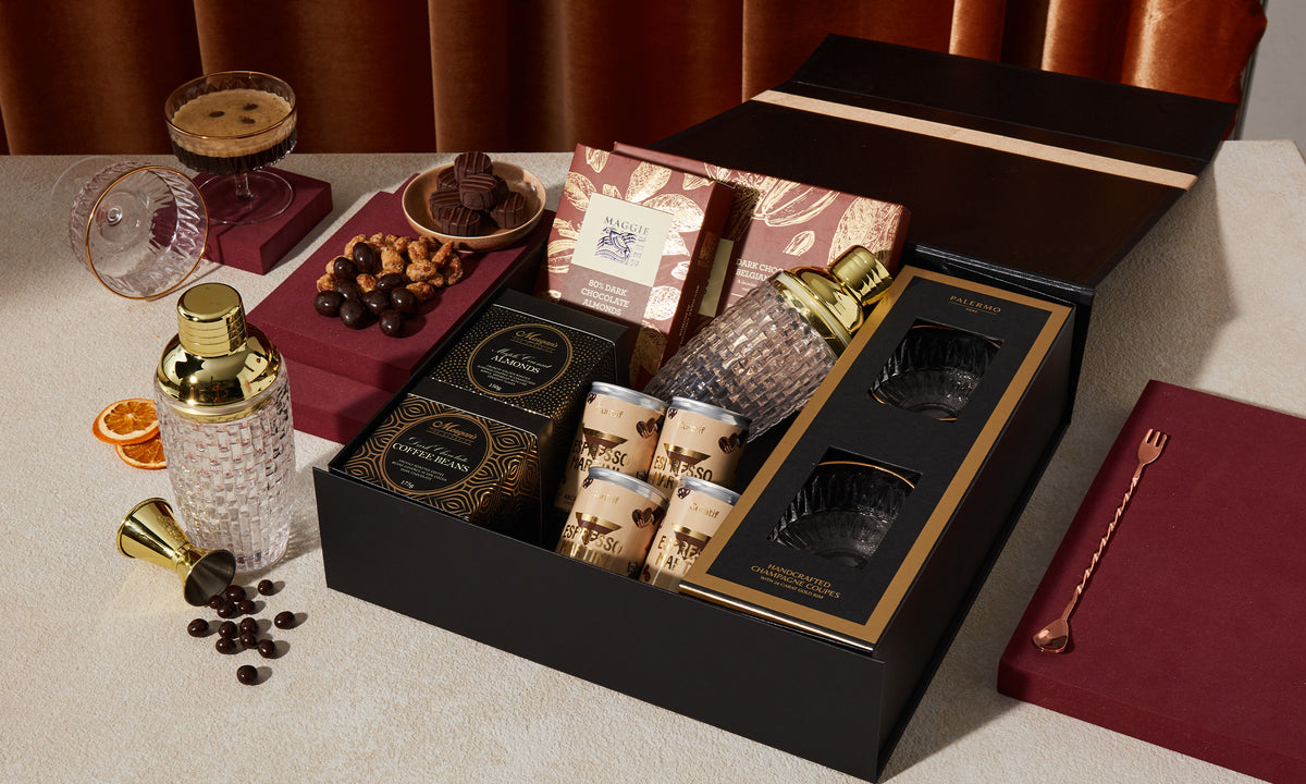 This cocktail hamper has everything needed to host a brunch or cocktail hour with homemade espresso martinis.