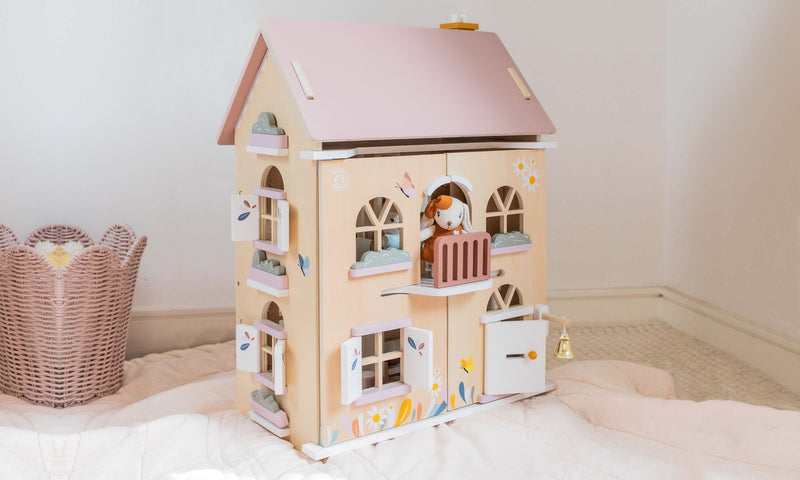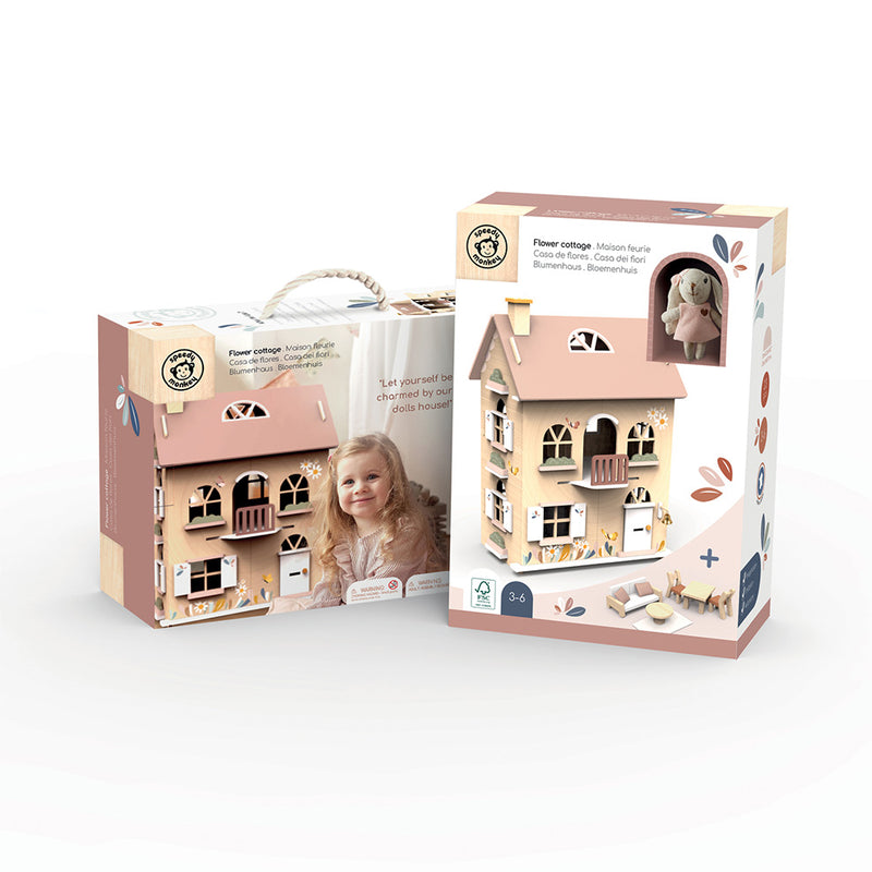 This beautiful cottage dollhouse will be the pride of the playroom with three levels and five rooms of fun.