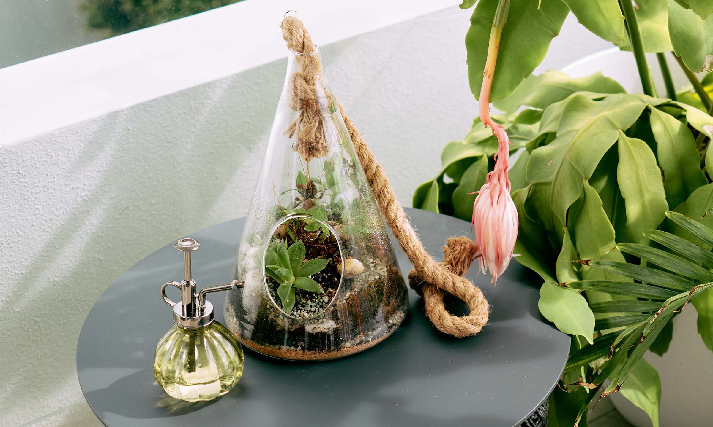 This terrarium is a strong rustic rope and cut glass plant terrarium; just add pebbles, soil, plants and love.