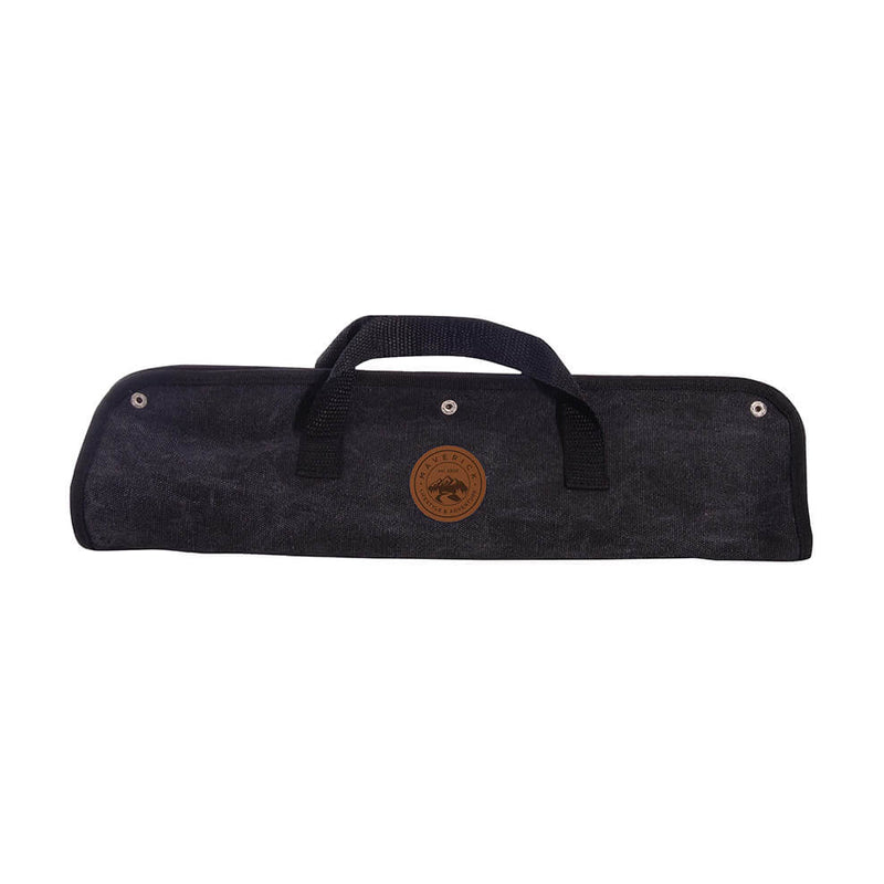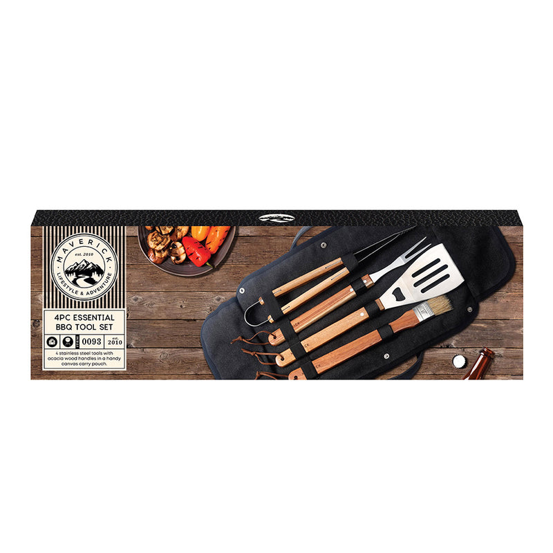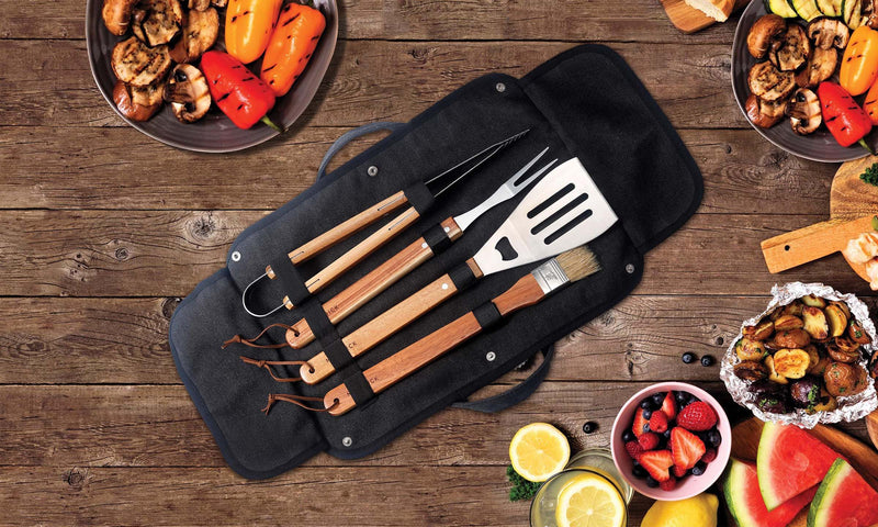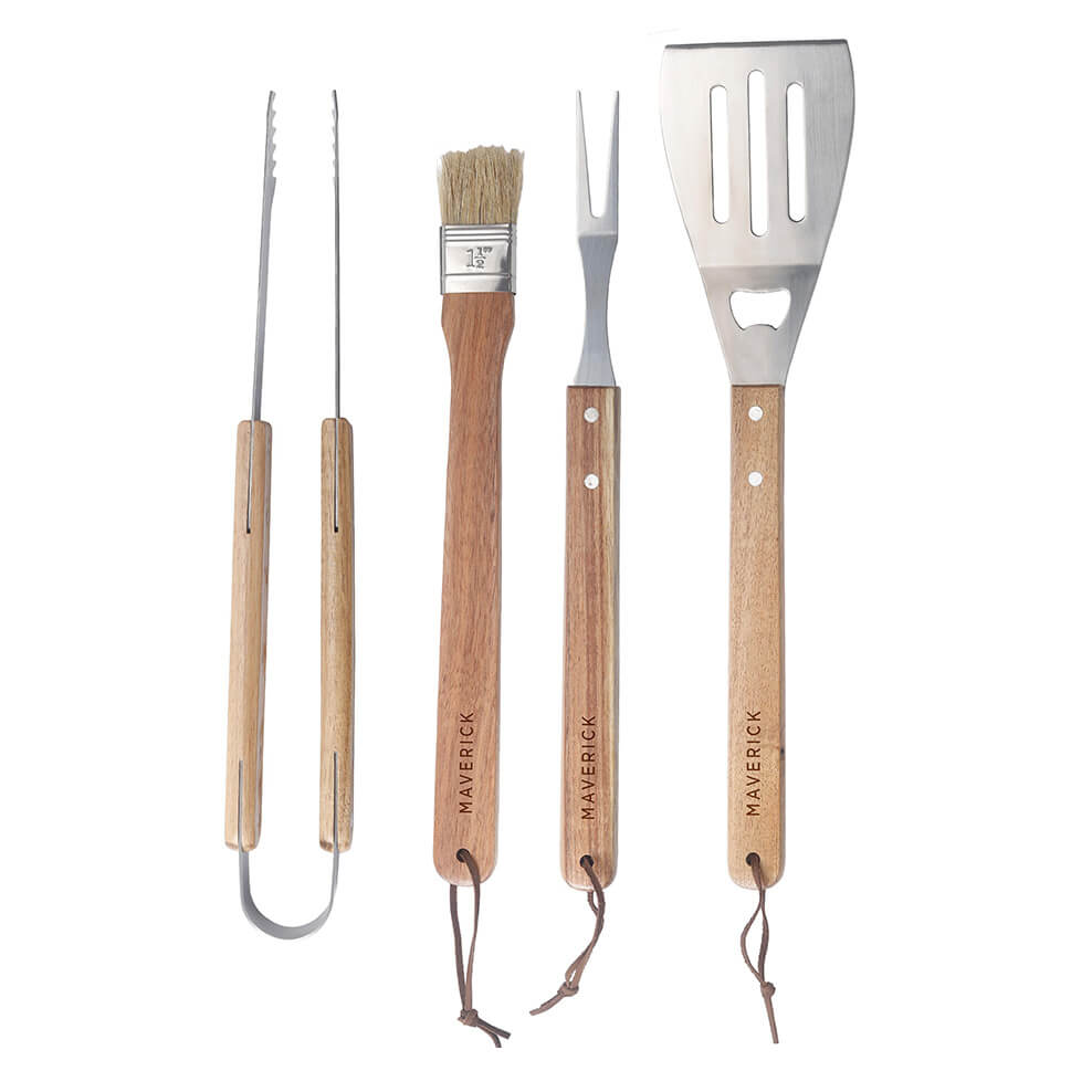 This stainless steel and acacia wood BBQ tool set has tongs, a basting brush, a meat fork, and a turner.