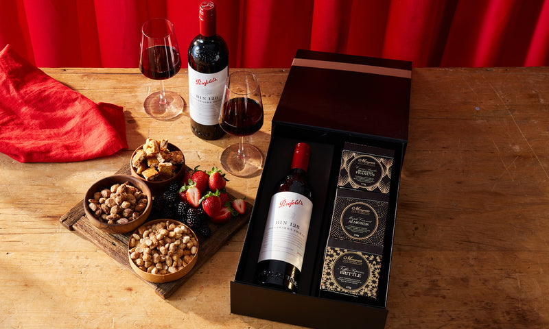 The star of this gourmet hamper is Penfolds Bin 128 Coonawarra Shiraz and it comes with artisan sweet nuts.