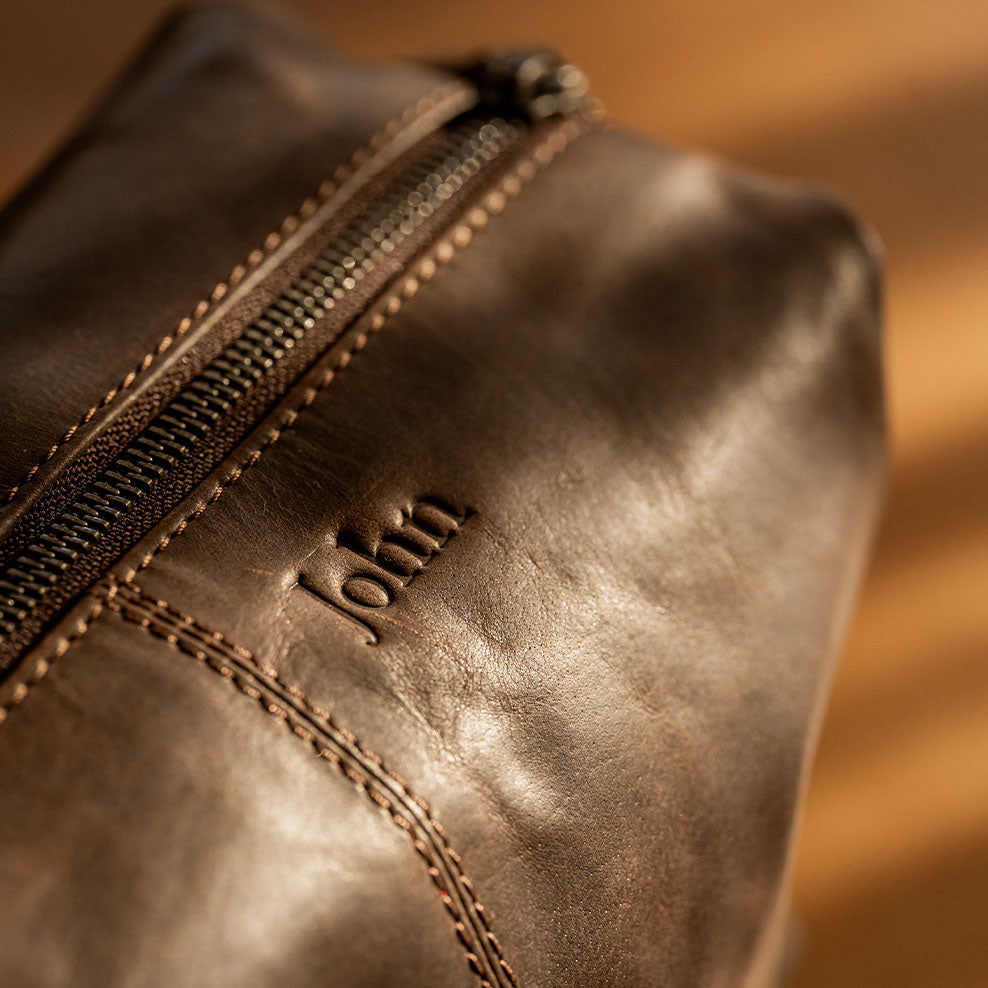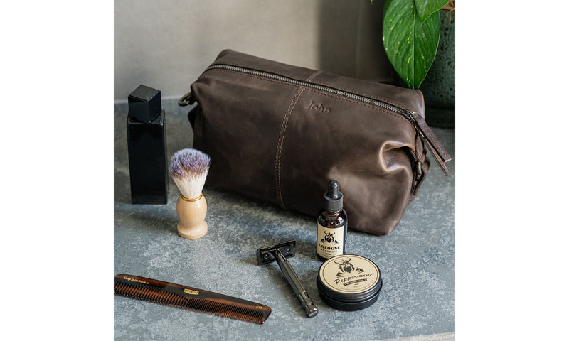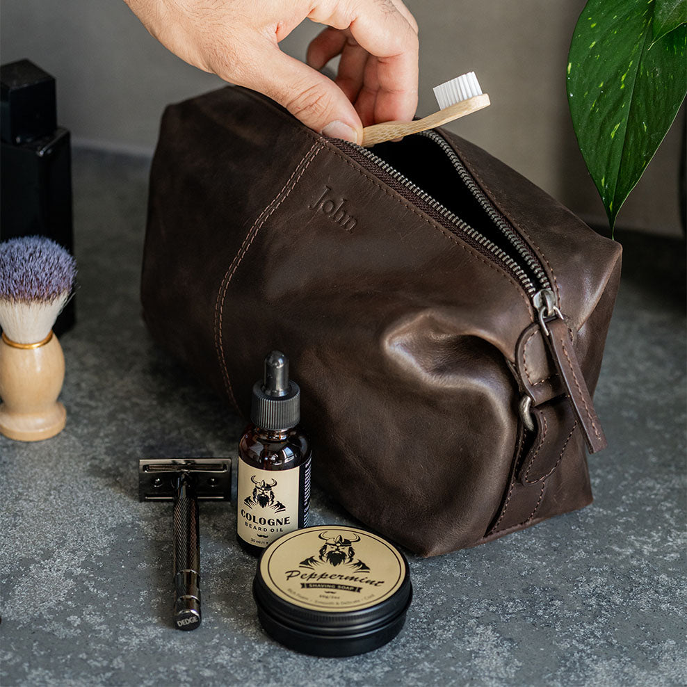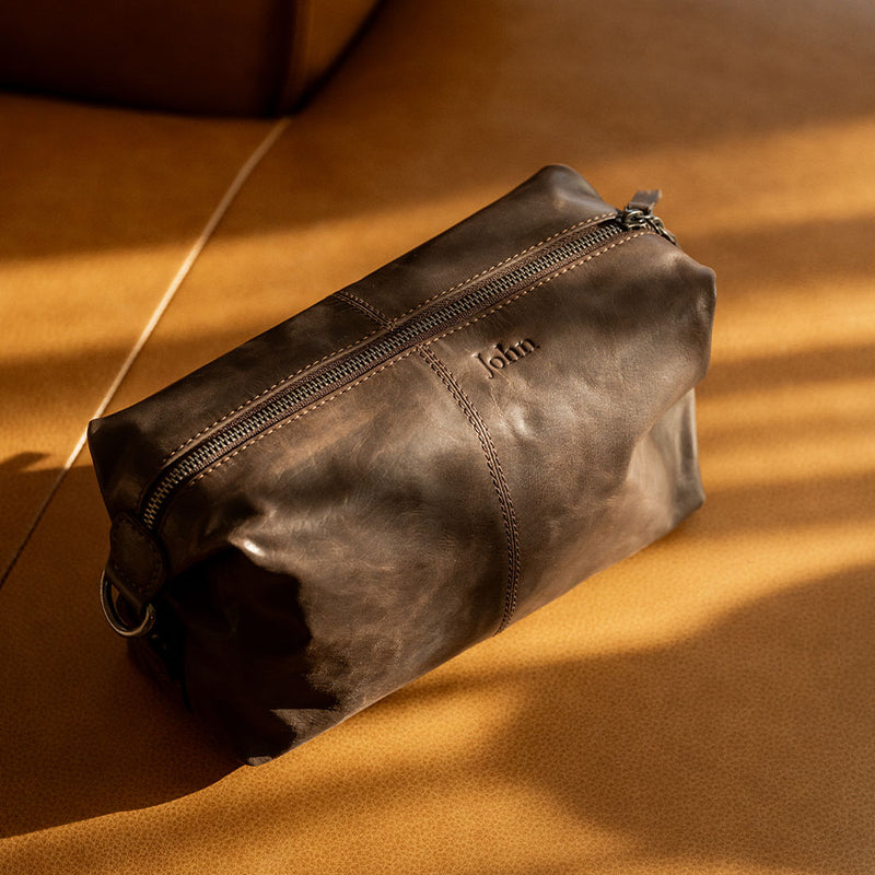 Help him keep his grooming essentials organized with this personalized leather toiletry bag.