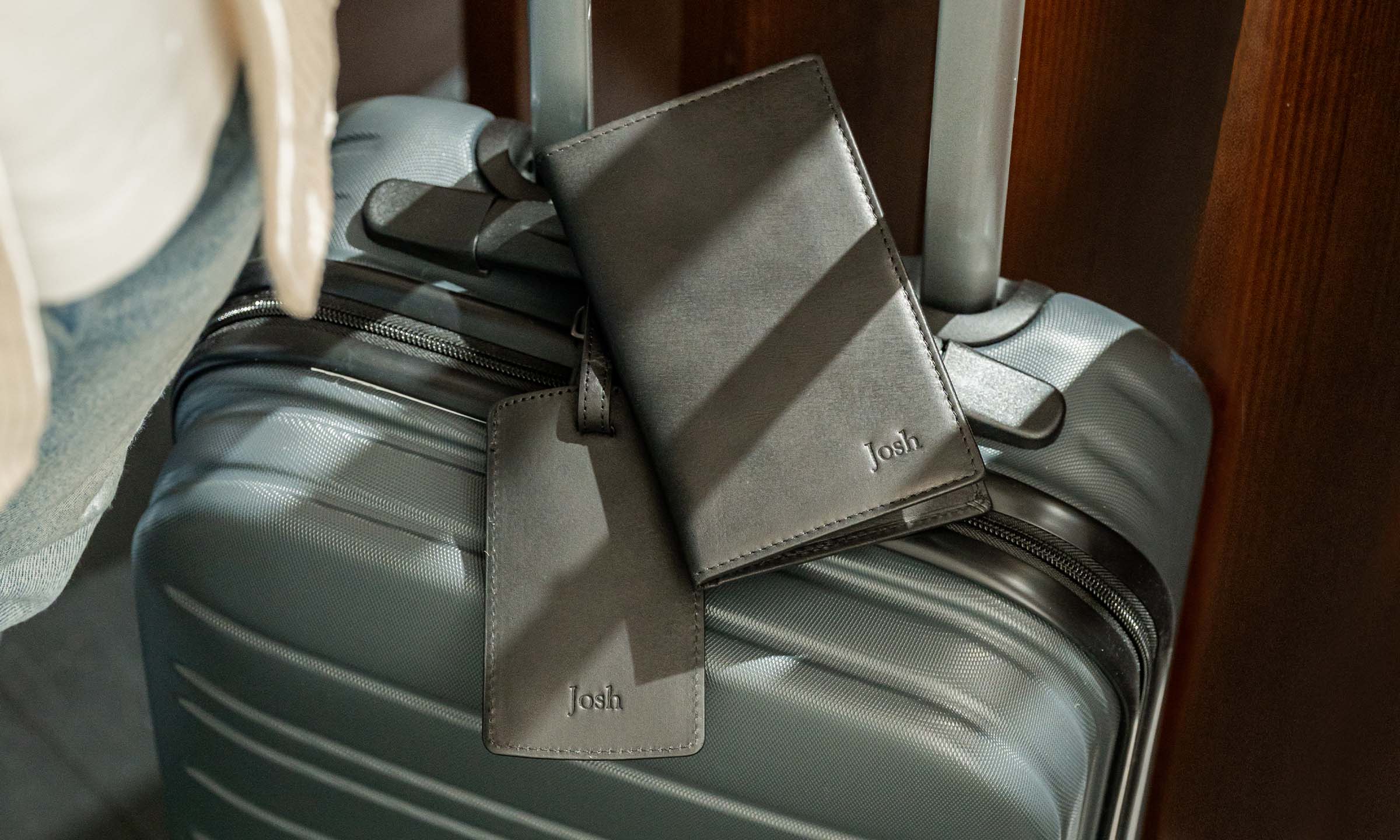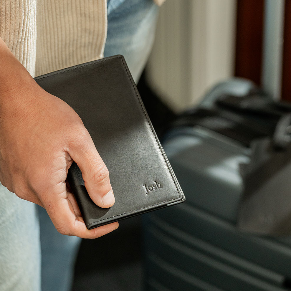 He'll love this leather set featuring his own personalised passport cover and luggage tag.