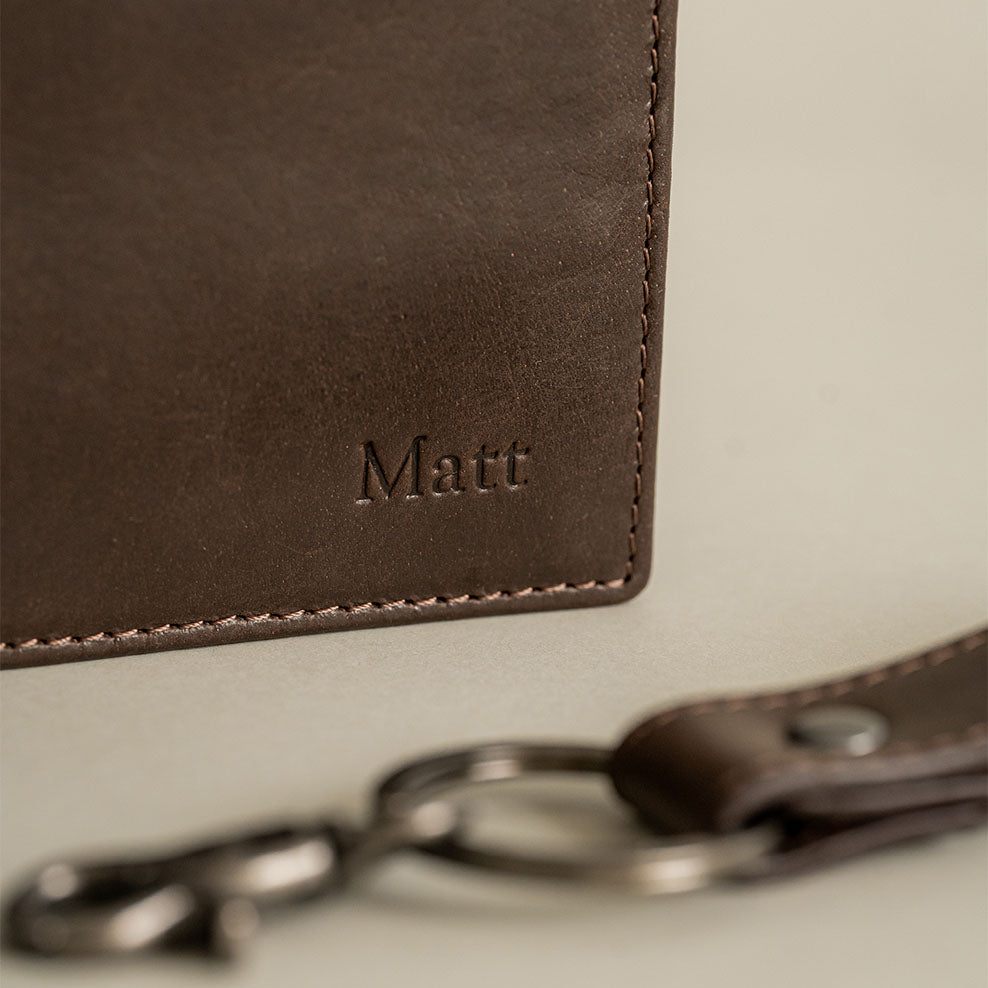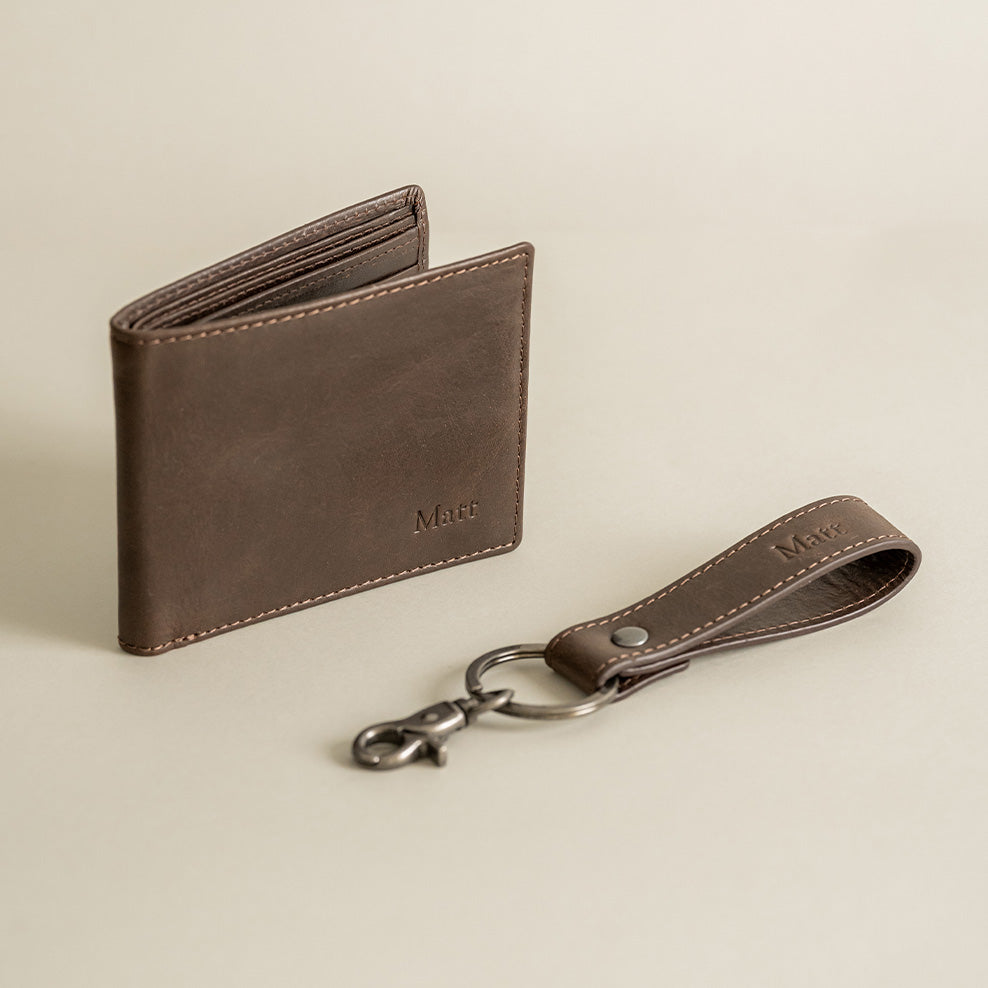 Design meets practicality with this Personalised Brown Leather Wallet & Keyring Set.